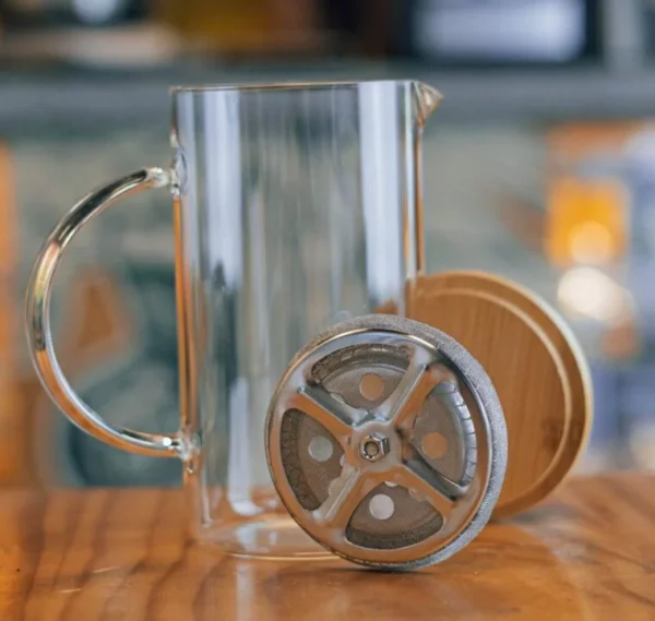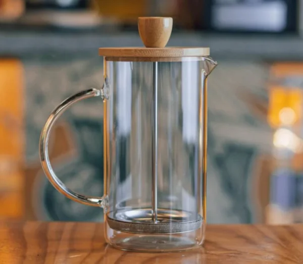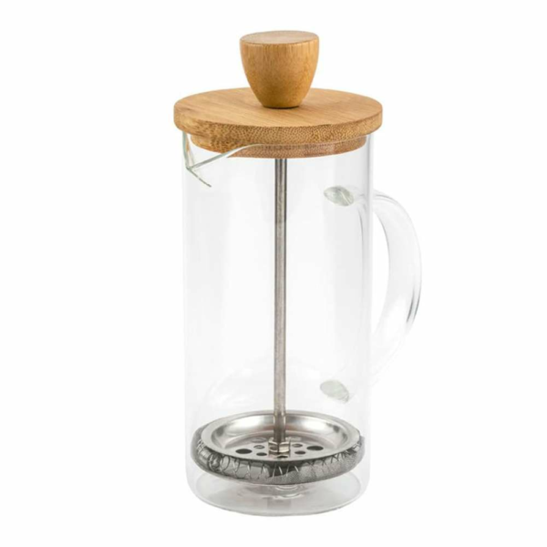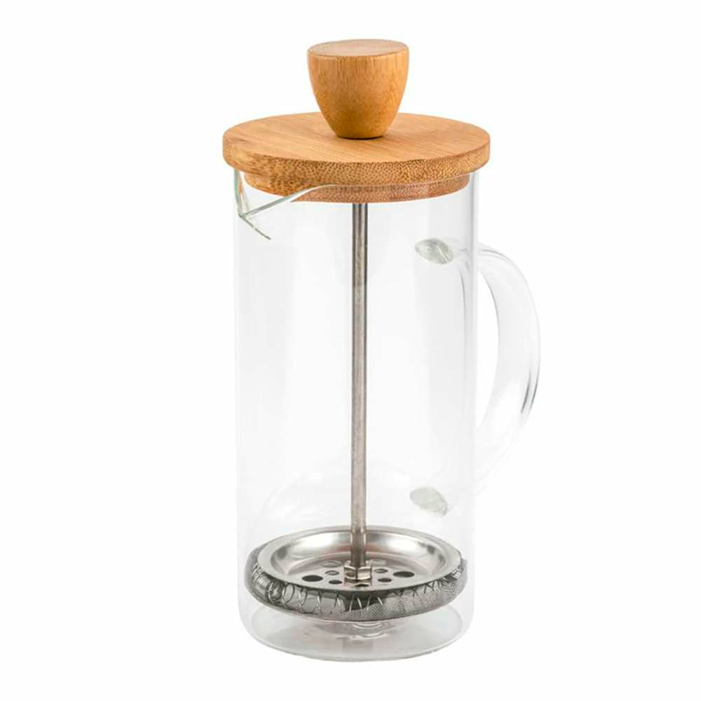 Prensa Francesa de bambú de 350 ML, filtro de acero inoxidable, mango de vidrio y vaso de vidrio templado resistente a altas temperaturas.