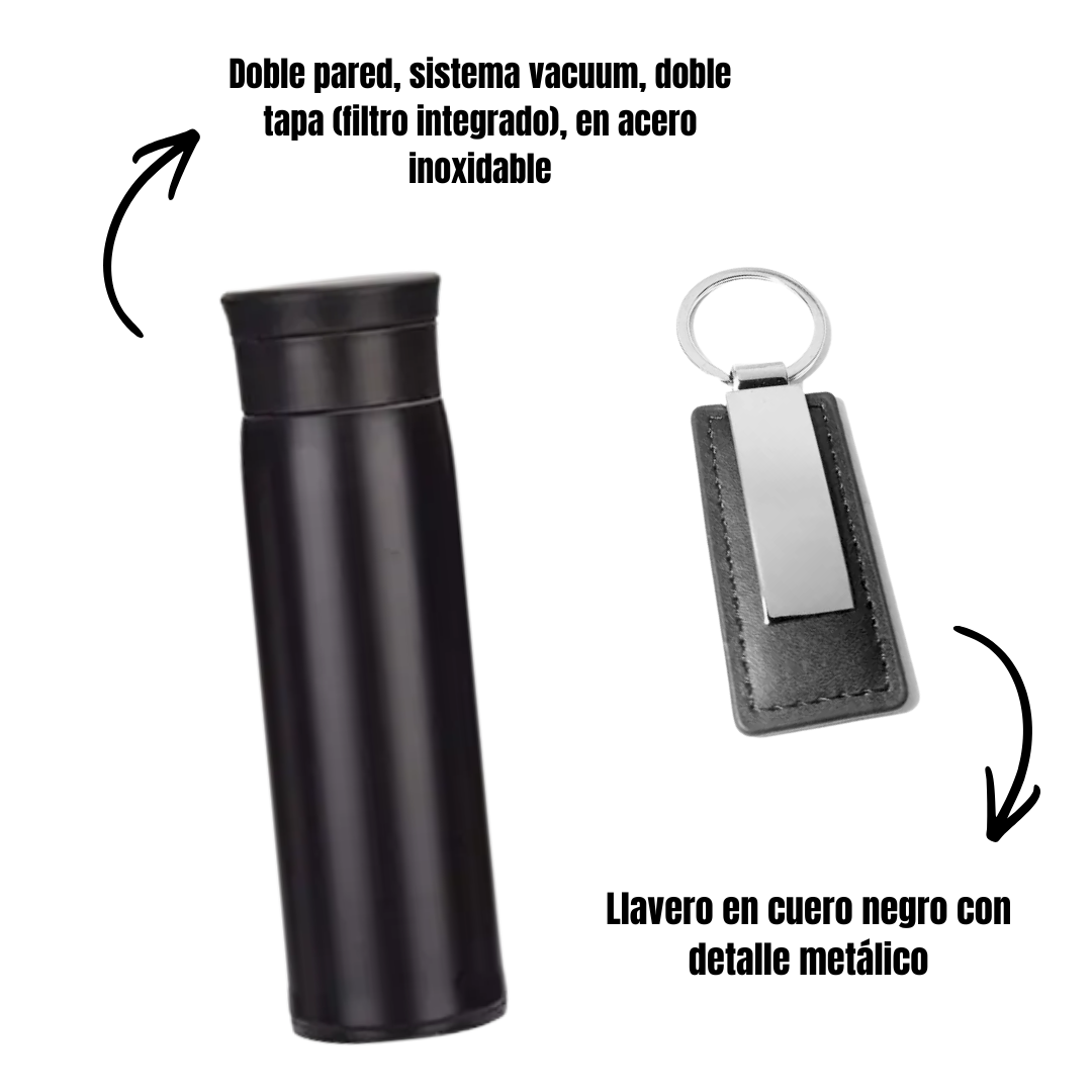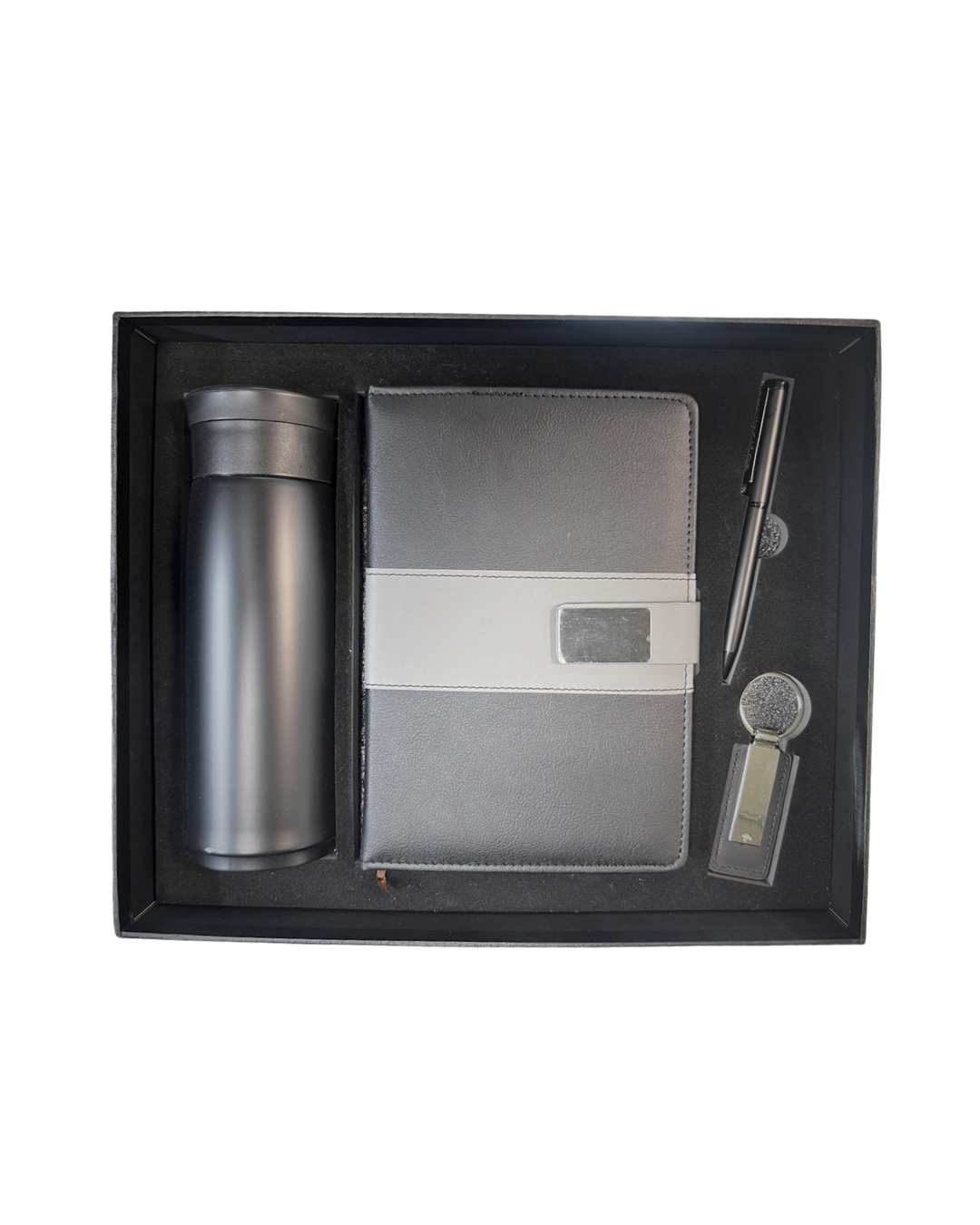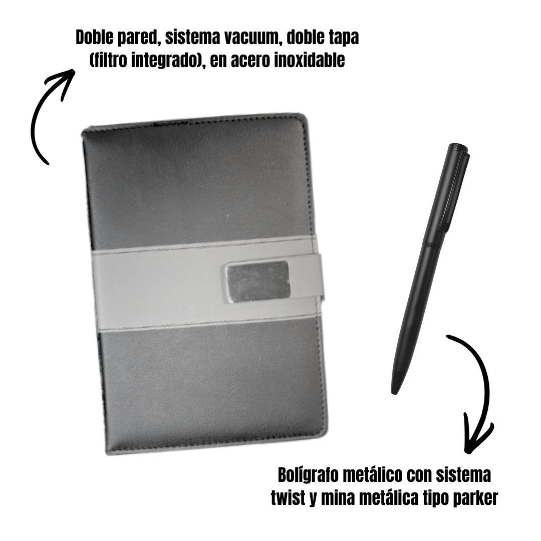 Set ejecutivo exclusivo con estuche de lujo. Incluye bolígrafo en aluminio con sistema twist. Libreta con 100 hojas blancas rayadas, cierre magnetico con placa metálica. Termo de 500 ml vacuum en acero inoxidable con doble tapa rosca. Llavero en cuero con detalle metálico.