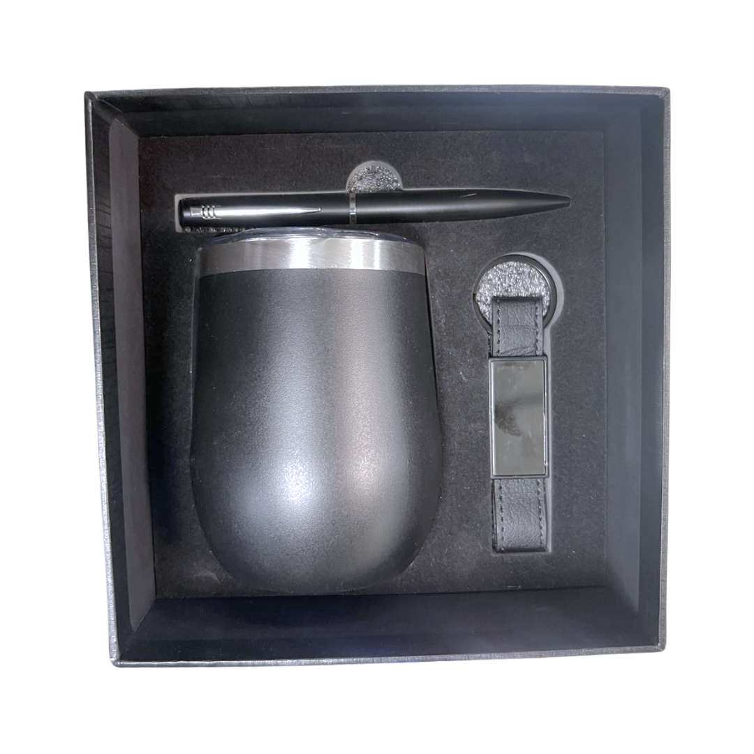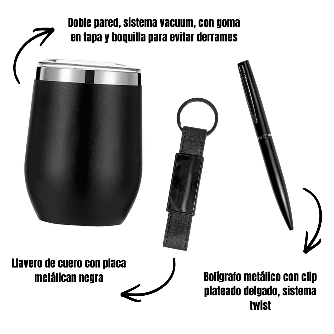 Set ejecutivo con estuche de lujo. Incluye bolígrafo en aluminio con sistema twist. Mug de 350 ml vacuum en acero inoxidable con tapa a presión con banda de silicona para transportar con facilidad. Llavero en cuero con detalle metálico y placa metálica negra.